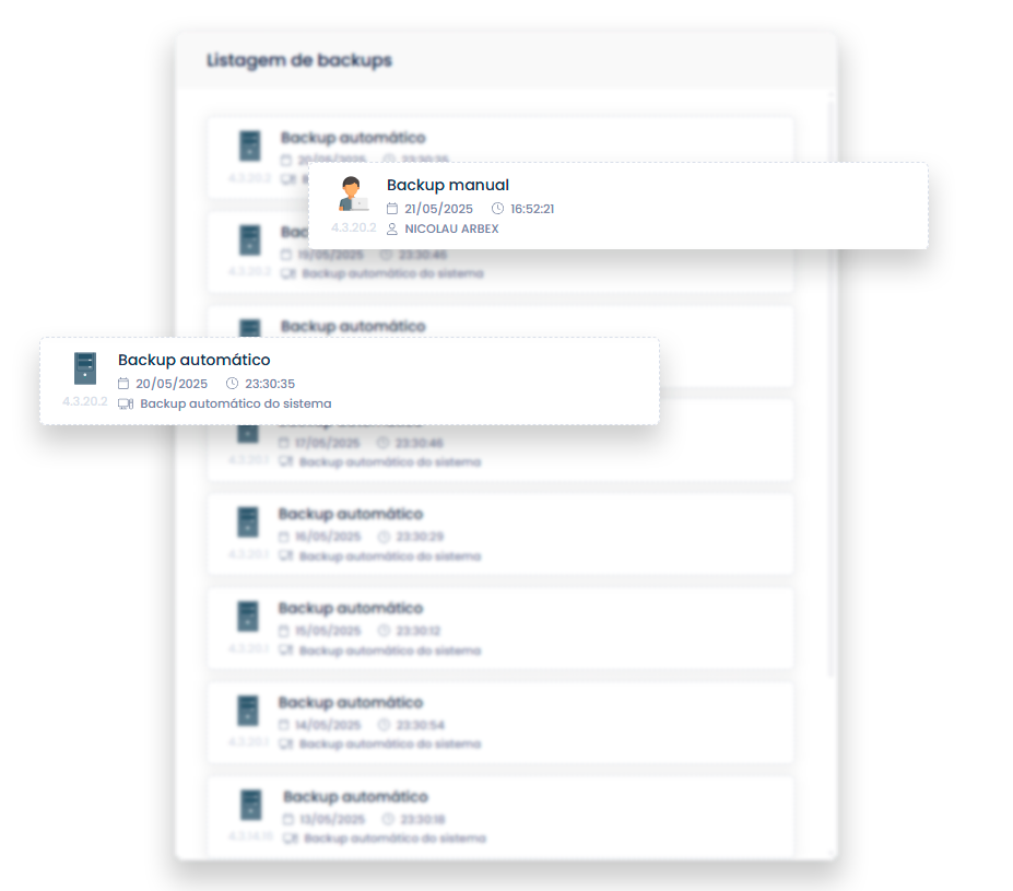 Backups diários automáticos em servidor secundário e cópias manuais sob demanda com um clique. Restaure qualquer versão em segundos e mantenha seus dados sempre disponíveis e seguros, sem complicações.