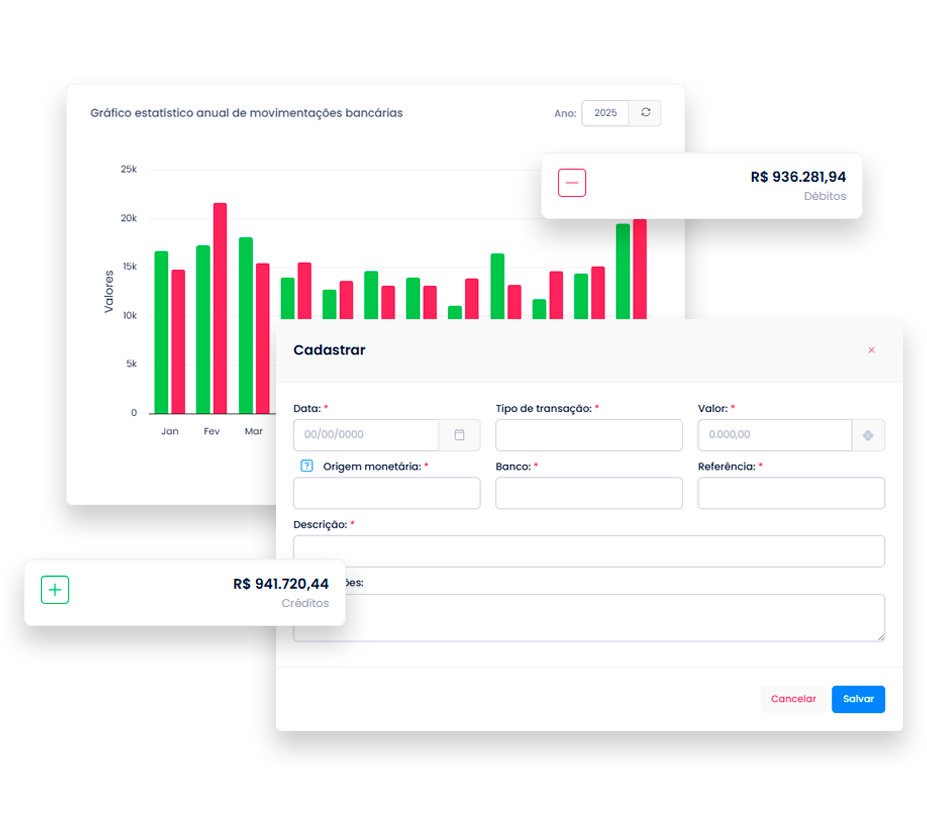 Registre, monitore e analise toda a sua movimentação em poucos cliques: cadastre depósitos, saques e transferências entre contas (com saída e entrada lançadas automaticamente), visualize saldos consolidados e gráficos estatísticos mensais, e filtre os lançamentos para exibir agrupamentos por dia — tudo de forma simples e rápida.