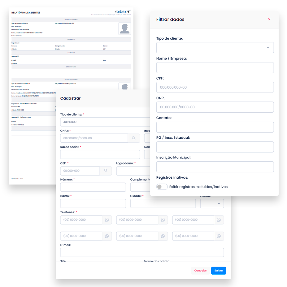 Centralize o registro de clientes, fornecedores e transportadoras com busca automática por CEP e CNPJ, filtros robustos para encontrar qualquer cadastro em instantes e anexos de documentos (PDF ou imagem). Registros são apenas inativados — nunca excluídos — garantindo histórico íntegro e possibilidade de restauração. Ainda conta com visualização detalhada dos dados e geração de relatórios completos para um controle absoluto dos seus cadastros.