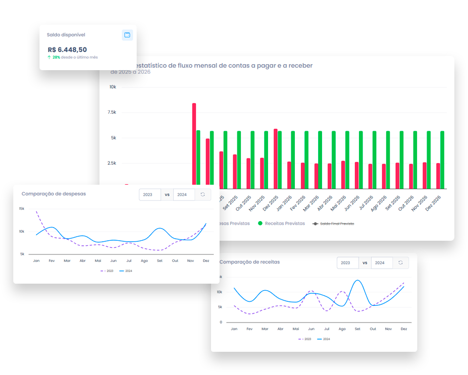 Monitore todas as suas entradas e saídas em painéis interativos – visualize receitas, despesas, saldos realizados e projeções futuras em gráficos claros e dinâmicos. Tenha o controle total do seu financeiro para antecipar cenários, evitar surpresas e planejar o crescimento do seu negócio com segurança.