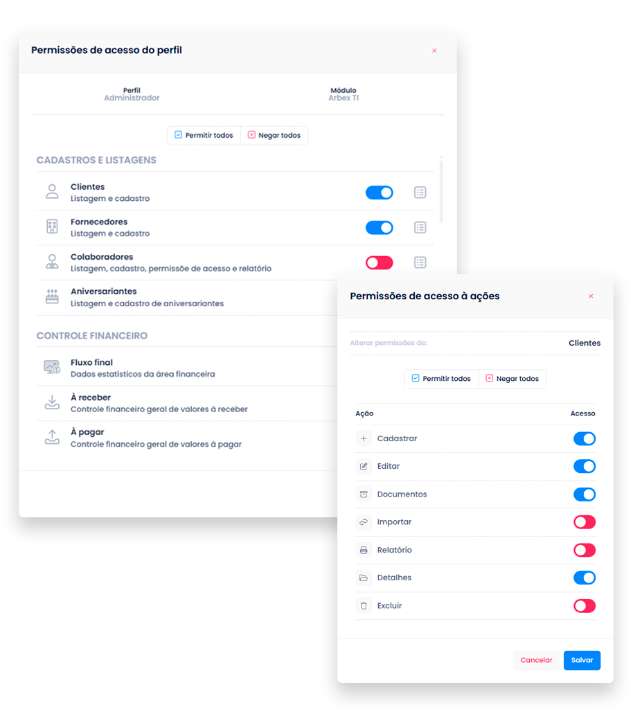 Defina e administre níveis de acesso com máximo controle: crie perfis personalizados, habilite ou negue funcionalidades por módulo e ação, e mantenha um registro completo de permissões. Tudo isso em uma interface intuitiva que garante segurança, conformidade e flexibilidade para o seu time.
